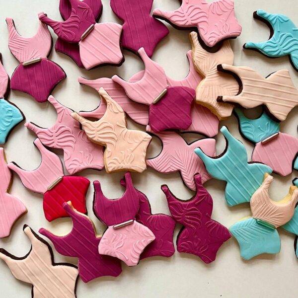 Każde ciasteczko zostało starannie wycięte w kształcie stylowego jednoczęściowego stroju kąpielowego. Kolory dominujące to: