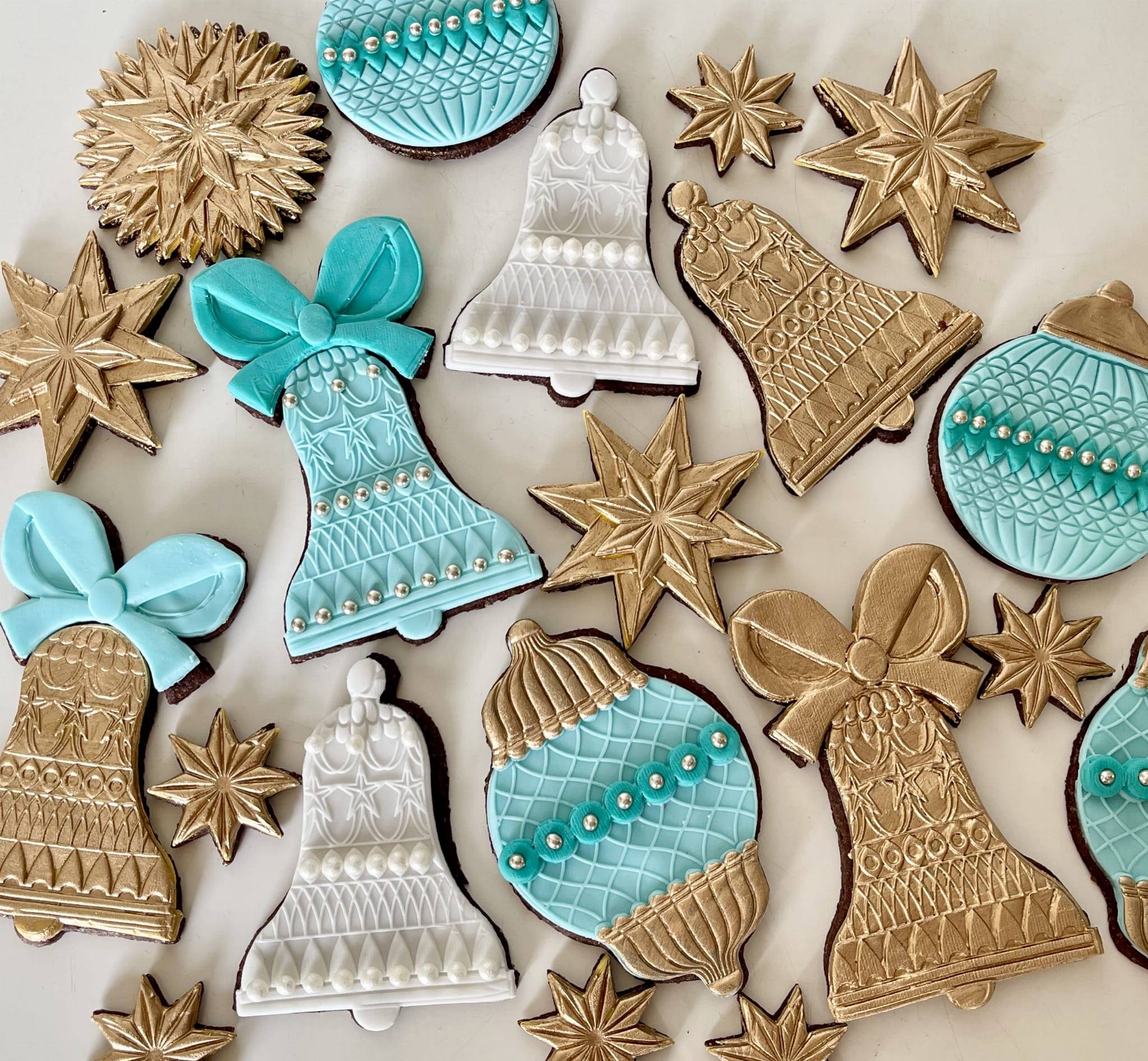 Pierniczki występują w kształtach dzwonków, bombek i gwiazd, dekorowane z niezwykłą starannością. Kolorystyka utrzymana jest w eleganckiej palecie świątecznej: biel, złoto i turkus dominują na powierzchni ciastek, przyciągając wzrok i tworząc niepowtarzalny klimat. Złote i perłowe akcenty, takie jak kokardy, zdobienia reliefowe i drobne kuleczki cukrowe, podkreślają ekskluzywny charakter produktu.