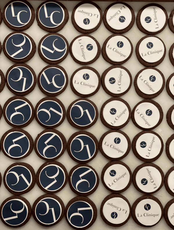 Na zdjęciu prezentujemy zestaw pierników okrągłych, precyzyjnie udekorowanych nadrukiem z logo marki „La Clinique”. Każde ciasteczko to starannie wypieczony piernik o gładkiej, ciemnej bazie (czekoladowej), udekorowany cienką warstwą lukru królewskiego w kolorze białym lub granatowym, na którym umieszczone zostało jadalne logo.