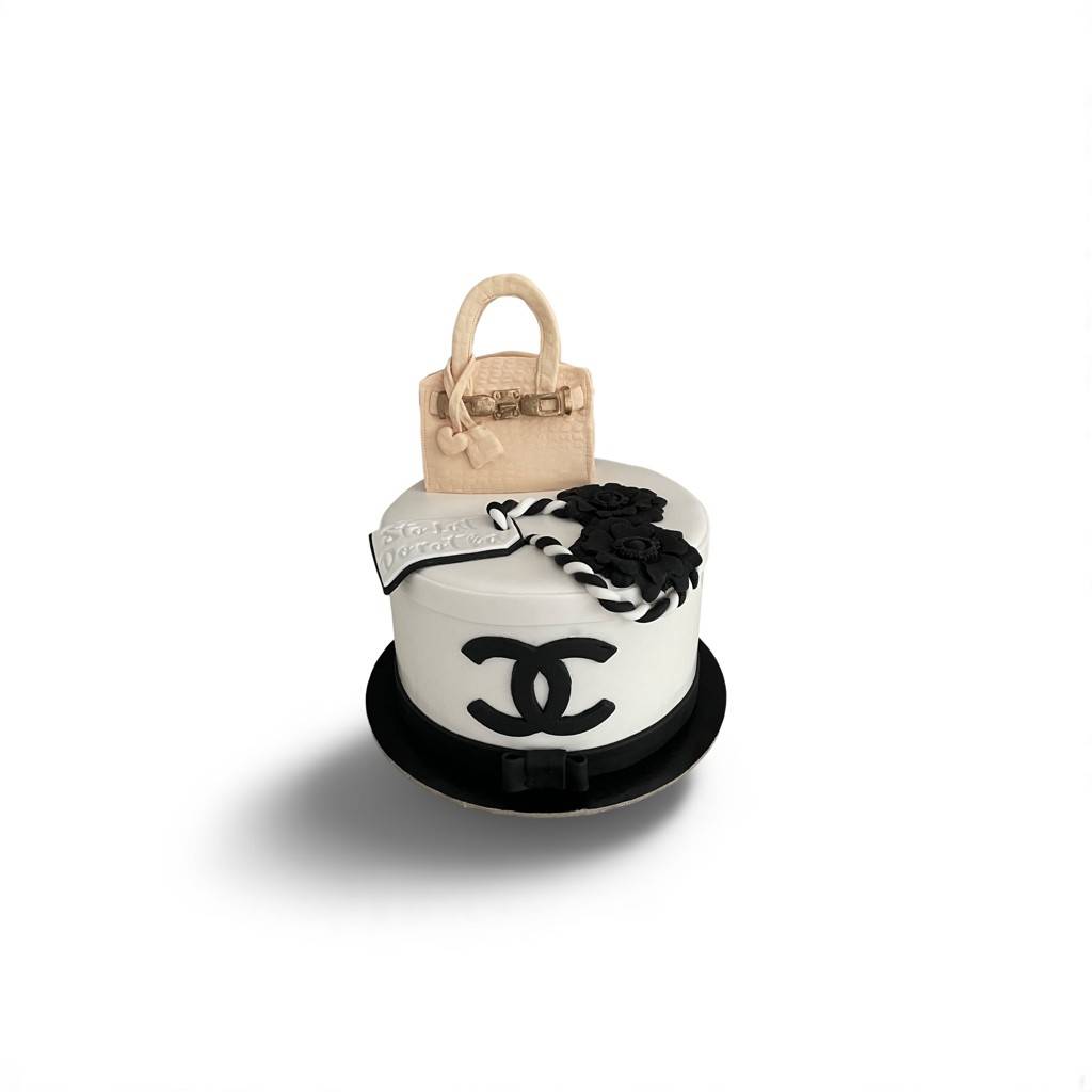 Tort utrzymany jest w eleganckiej czarno-białej kolorystyce z charakterystycznym logo Chanel na froncie. U podstawy ozdobiony jest subtelną czarną kokardką z masy cukrowej, która nadaje kompozycji wyrafinowania. Na wierzchu tortu znajduje się efektowna, trójwymiarowa dekoracja w postaci kultowej torebki Birkin – wykonana z modelowanej masy cukrowej w odcieniu beżowego złota.