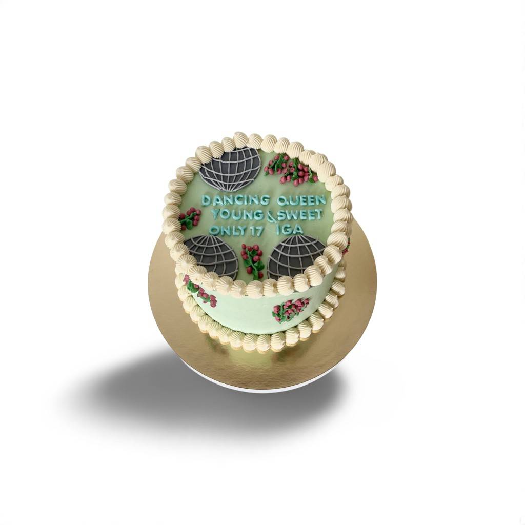 Tort zachwyca swoją pastelową kolorystyką – miętowo-zielona baza przełamana jest białymi dekoracjami kremowymi i wykończeniami w stylu vintage. Na wierzchu tortu znajdziemy srebrne kule dyskotekowe wykonane z masy cukrowej, ozdobne kwiaty i napisy inspirowane słowami słynnego hitu „Dancing Queen” zespołu ABBA.