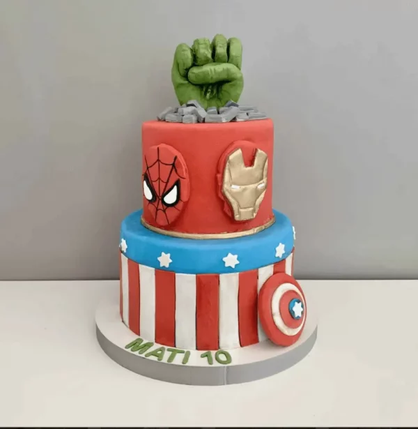 Wielopoziomowy, efektowny tort inspirowany światem Marvela i legendarną drużyną Avengers! Każde piętro to hołd dla innego bohatera: tarcza Kapitana Ameryki, młot Thora, pięść Hulka, strzały Hawkeye’a czy logo Iron Mana – wszystko wykonane z jadalnych dekoracji. Kolorowy, dynamiczny i pełen akcji – zachwyci każdego małego (i dużego!) fana superbohaterów.