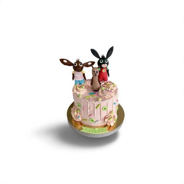 Tort Bingo i Flop to idealna propozycja dla najmłodszych fanów popularnej bajki „Bing”. Ten bajkowy tort to nie tylko kulinarna rozkosz, ale i magiczna dekoracja przyjęcia urodzinowego. Różowy, kremowy tort z efektem drip (spływająca polewa), udekorowany jadalnymi gwiazdkami i pastelowymi posypkami, przyciąga wzrok i wprowadza radosny klimat. Główną atrakcją są ręcznie wykonane figurki Bing’a, Flopa oraz ich przyjaciół – idealnie odwzorowane, ustawione na górze tortu. Na froncie znajduje się personalizowany napis z imieniem i wiekiem dziecka.