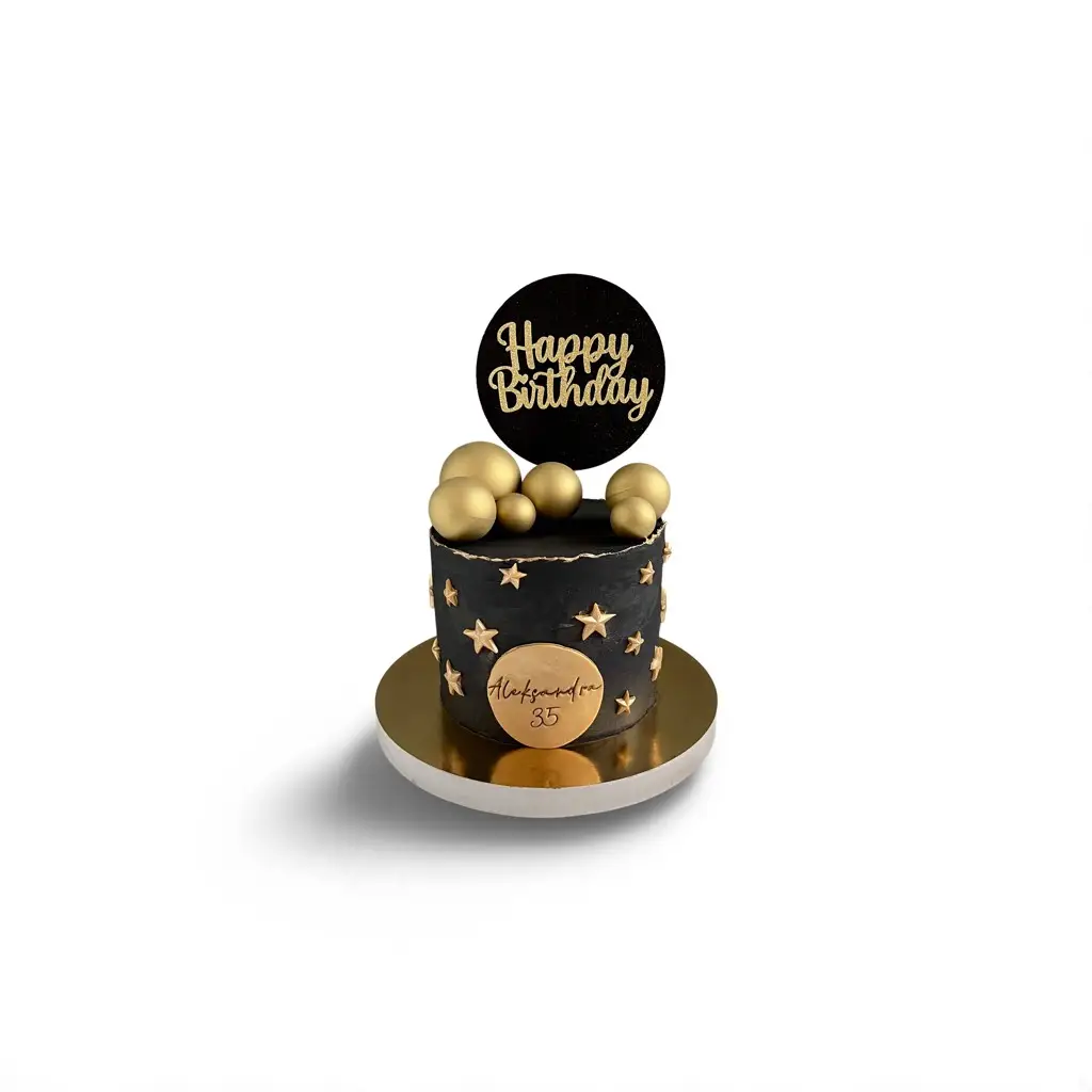Głównym elementem dekoracyjnym tego tortu są jadalne, błyszczące kulki w odcieniu złota oraz złote gwiazdki rozproszone po czarnej powierzchni. Na górze tortu znajduje się topper z napisem „Happy Birthday”, który podkreśla świąteczny charakter wypieku. Całość umieszczona jest na złotej podstawie, co dodatkowo potęguje wrażenie luksusu i stylu.