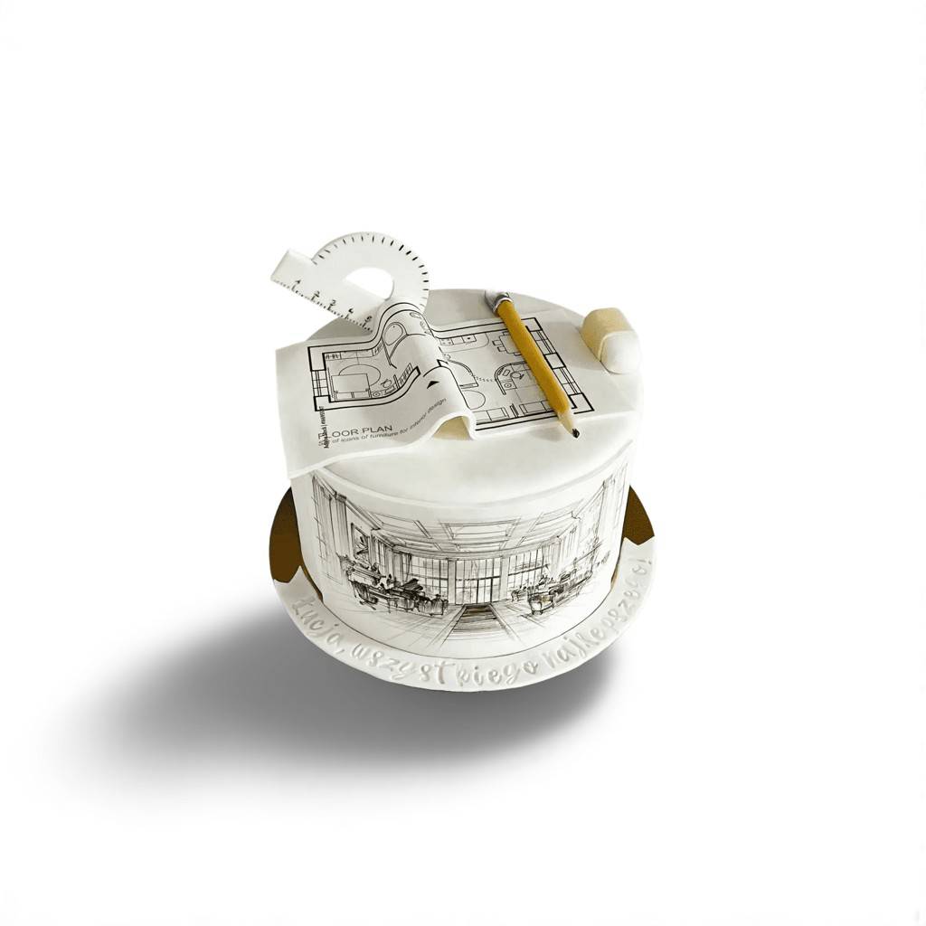 Prezentowany tort został ozdobiony spektakularną grafiką przedstawiającą projekt wnętrza oraz rozwinięty rzut techniczny pomieszczeń, precyzyjnie odwzorowany na górnej warstwie. Dodatkowo tort dekorują realistyczne rekwizyty – ołówek, kątomierz i zwinięta makieta – wszystko wykonane z jadalnych składników. Te elementy nie tylko przyciągają wzrok, ale są także w pełni bezpieczne do spożycia.