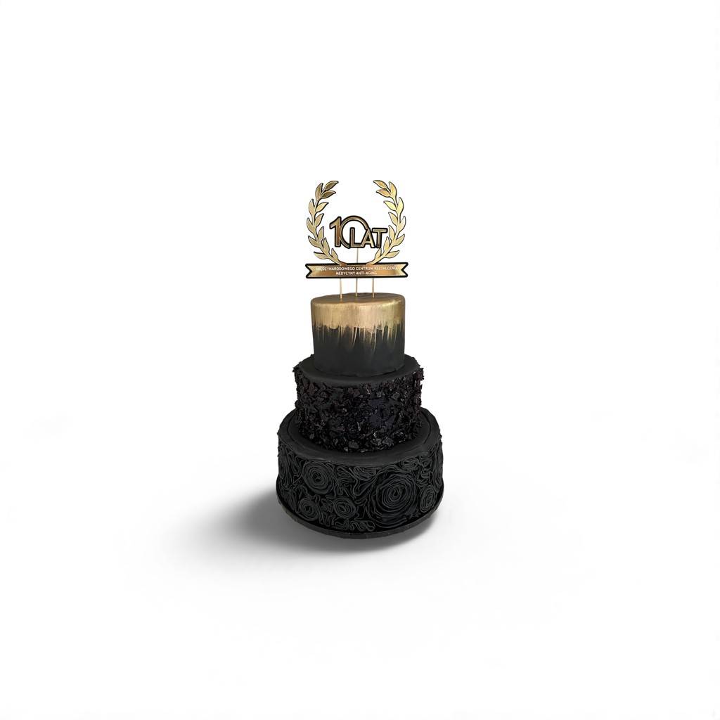 - Górna warstwa – efektowna w złoto-czarnym przejściu ombre z połyskiem i topperem “10 LAT” ze złotymi liśćmi laurowymi