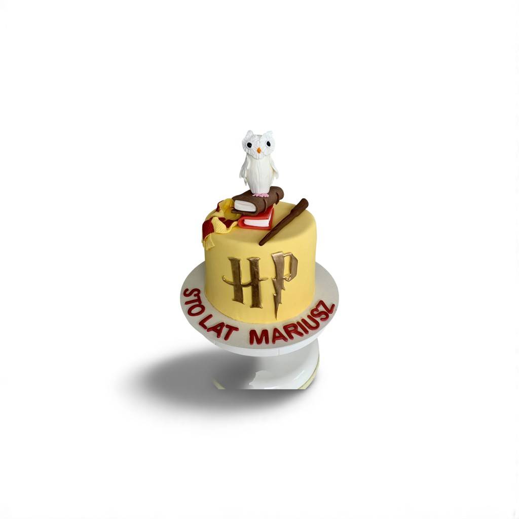 Dla miłośników magii, czarodziejskich zaklęć i przygód w świecie Hogwartu mamy wyjątkową propozycję – Tort Harry Potter z sową. To idealny wybór na urodziny każdego fana tej kultowej sagi! Na zdjęciu widzimy efektowny tort pokryty żółtą masą cukrową z charakterystycznym logotypem HP oraz figurkami symbolizującymi świat czarodziejów: sową Hedwigą, księgami zaklęć, różdżką i szalikiem w barwach Gryffindoru.