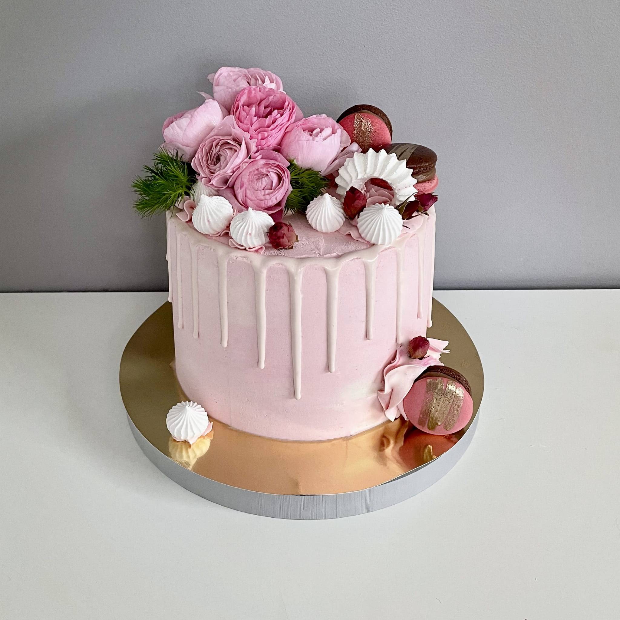 Tort został pokryty subtelnym, jasnoróżowym kremem maślanym lub śmietanowym (do wyboru), którego pastelowy odcień doskonale komponuje się z białym dripem stworzonym z aksamitnej polewy czekoladowej. Górę tortu zdobią efektowne dekoracje: