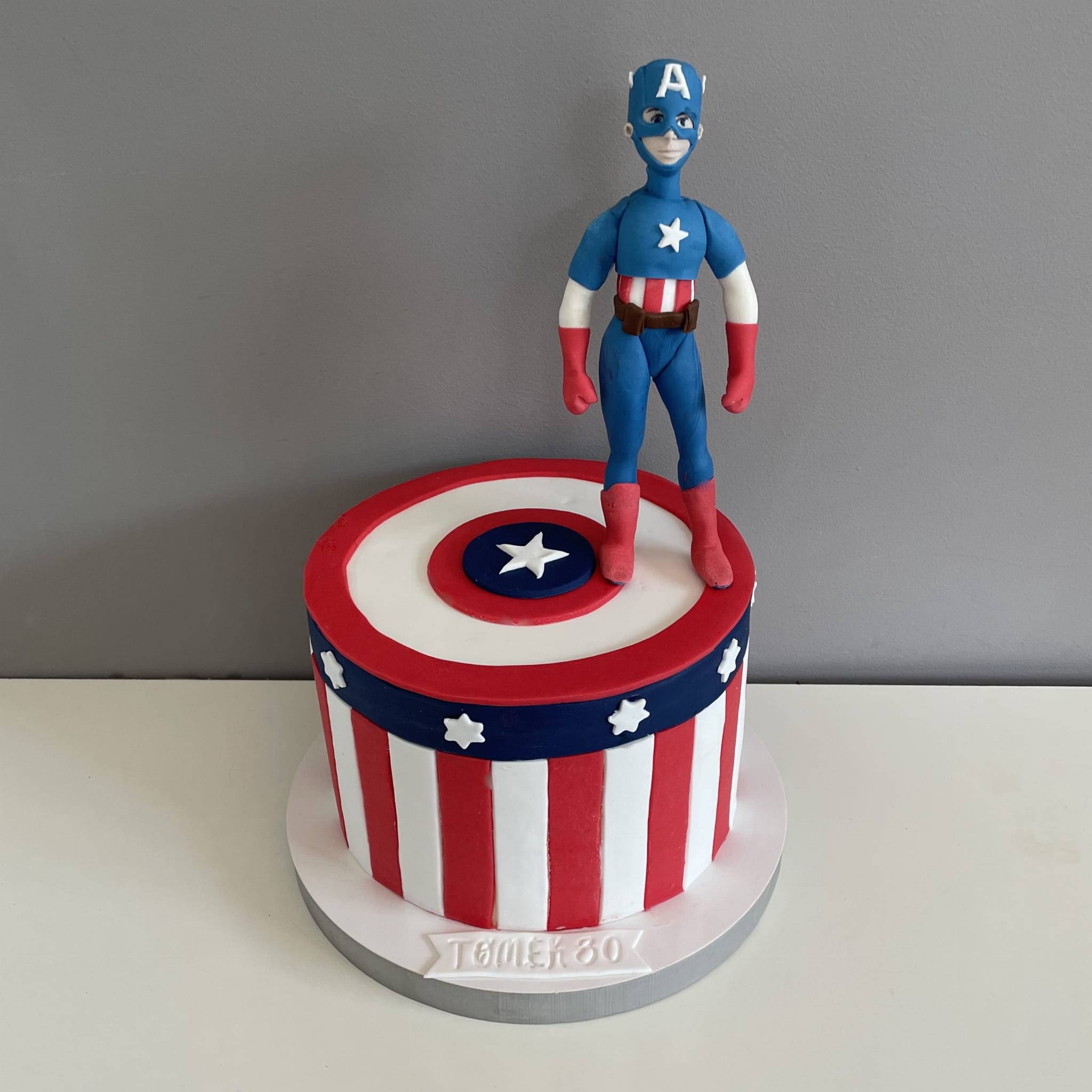 Ten elegancki, cylindryczny tort przyciąga uwagę swoją patriotyczną estetyką. Jego ścianki dekorowane są pionowymi pasami w kolorach czerwonym i białym, nawiązującymi do stroju Kapitana Ameryki. Górna część tortu przypomina jego kultową tarczę – biały krąg, czerwone okręgi i środek z białą gwiazdą na niebieskim tle.
