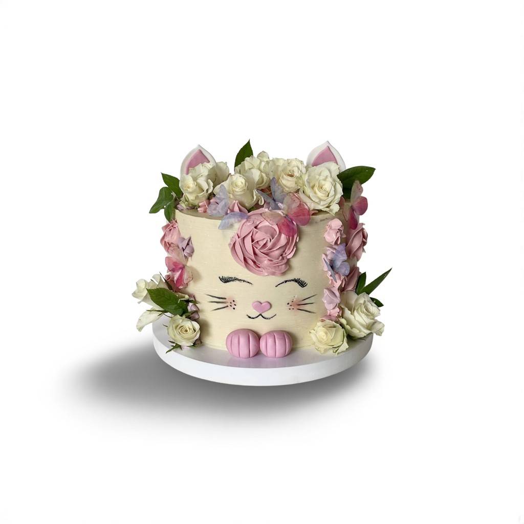 Tort ma kremową, delikatną powierzchnię ozdobioną różowymi łapkami, zamkniętymi oczkami i uśmiechniętą mordką. Główę kotka zdobią naturalne i cukrowe kwiaty w pastelowych kolorach – róże, hortensje i liście, które tworzą efekt eleganckiej i zarazem dziecięcej kompozycji. Kocie uszy z masy cukrowej podkreślają jego charakter. Całość jest radosna, urocza i estetyczna – perfekcyjna na każdą okazję!