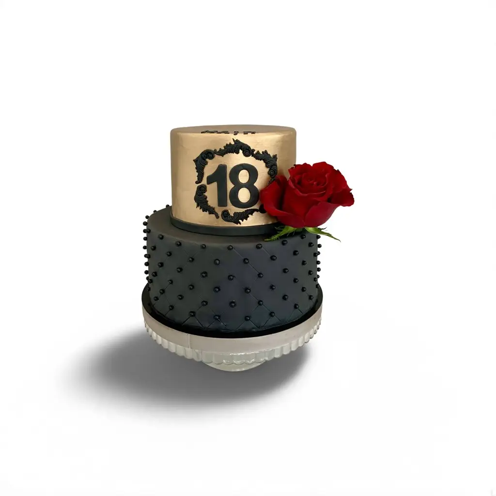 Dolne piętro tortu pokryte jest intensywnie czarną masą cukrową z dekoracyjnymi, drobnymi perełkami z lukru, które tworzą efekt eleganckiej tekstury 3D. Górne piętro w całości zostało wykończone jadalną złotą farbą spożywczą, co nadaje mu królewskiego charakteru. Na froncie umieszczono czarną, barokową ramkę z liczbą “18” – to centralny punkt dekoracji. Całość dopełnia czerwona róża – prawdziwy kwiat, umieszczony z boku tortu dla kontrastu i wyrazistości.