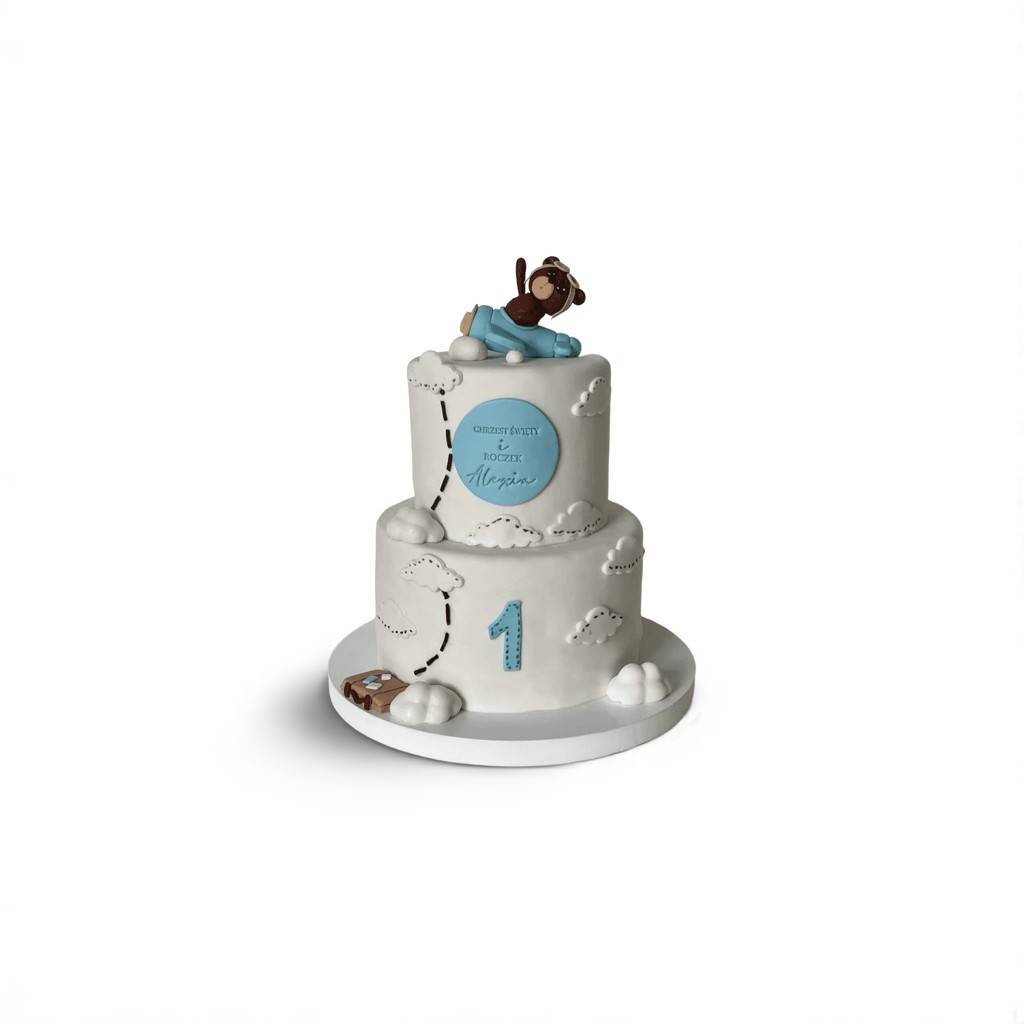 Na przedstawionym zdjęciu widoczny jest tort w białej kolorystyce z niebieskimi akcentami. Górę zdobi uroczy miś-pilot leżący na chmurce, symbolizujący beztroską podróż dziecka przez pierwszy rok życia. Po bokach tortu umieszczono rysunkowe chmurki i ścieżkę lotu z samolotem, a na dolnym poziomie znajduje się cyfra „1” oraz personalizowany napis “Chrzest Święty i Roczek Alexa” na okrągłej tabliczce z masy cukrowej. Każdy detal został wykonany ręcznie z wielką starannością.