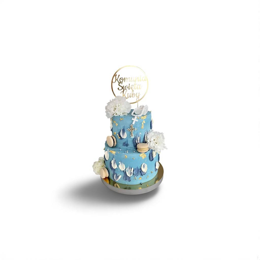 Przedstawiamy elegancki i zachwycający tort na komunię niebieski – idealny wybór na wyjątkowy dzień Pierwszej Komunii Świętej. Ten dwupoziomowy tort w błękitnej tonacji, ozdobiony białymi kwiatami, makaronikami i delikatnym złotem, łączy w sobie tradycję, subtelność i nowoczesne cukiernicze rzemiosło. Umieszczony na szczycie tortu topper „Komunia Święta” podkreśla podniosły charakter uroczystości i sprawia, że ten wypiek staje się głównym elementem słodkiego stołu.