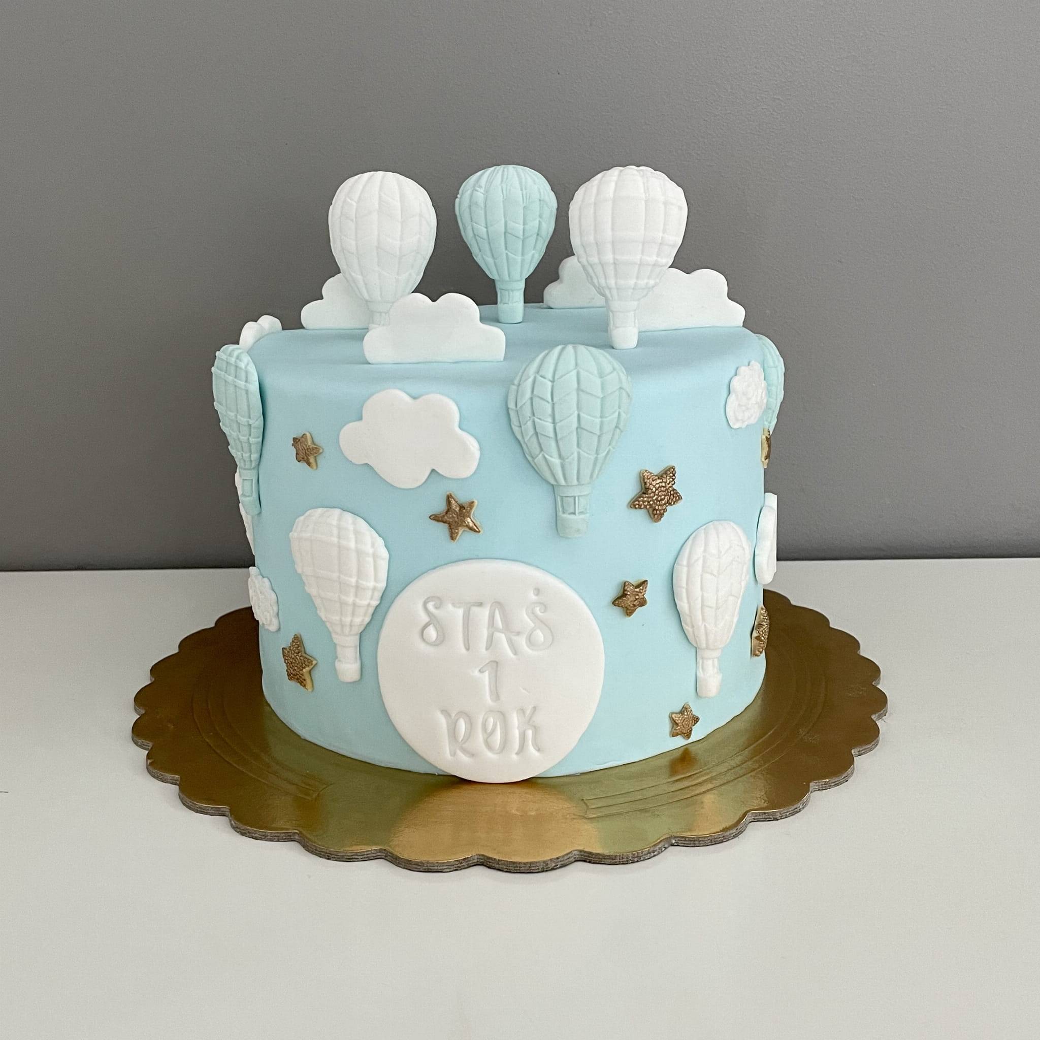 Nie ma nic bardziej uroczego niż tort na roczek balony, który unosi się wyobraźnią w błękitne niebo pełne chmur i złotych gwiazdek. Ten wyjątkowy tort został stworzony z myślą o pierwszych urodzinach malucha – w tym przypadku chłopca o imieniu Staś, ale oczywiście można go dowolnie personalizować. Tort inspirowany motywem lotu balonem to lekka, pastelowa kompozycja, która łączy w sobie elegancję, dziecięcą radość i słodką delikatność. Każdy jego detal przyciąga wzrok i budzi zachwyt gości – zarówno najmłodszych, jak i dorosłych.