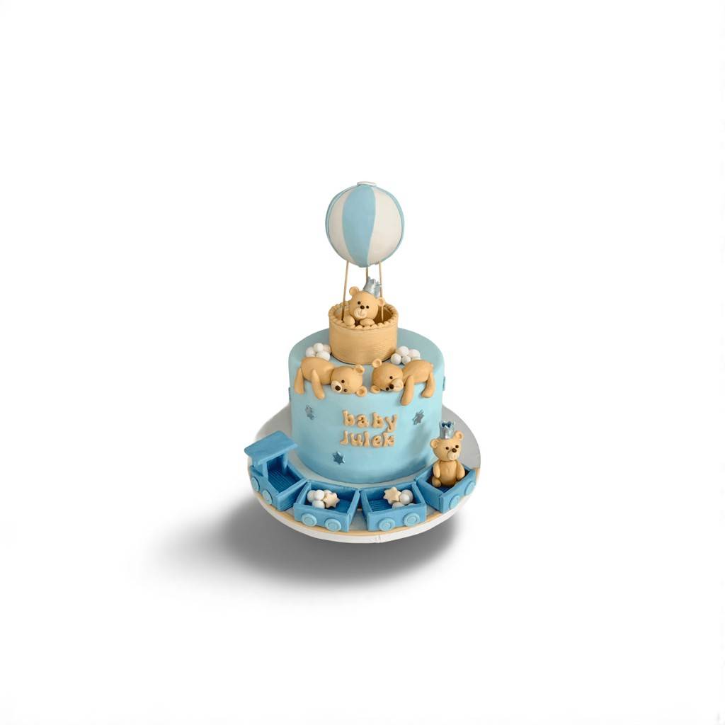 Tort składa się z dwóch pięter – każde z nich pokryte niebieskim lukrem plastycznym. Główne dekoracje to ręcznie wykonane misie z masy cukrowej, które wspinają się na balon lub bawią się na dole tortu. Całość dopełniają: