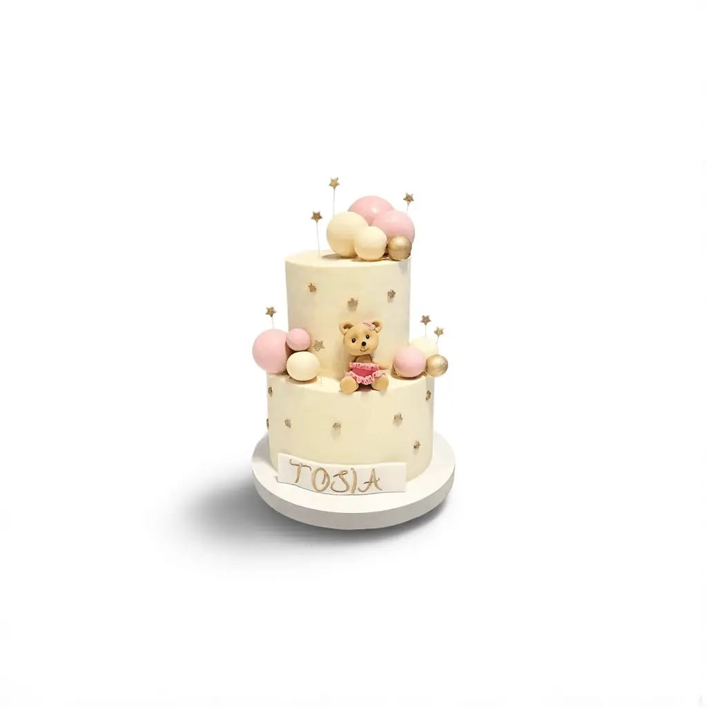 Tort na roczek z misiem i kulkami to niezwykle urocza propozycja na pierwsze urodziny Twojego dziecka. Dwupiętrowy tort w odcieniach śmietankowej bieli, ozdobiony różowymi, złotymi i białymi kulkami oraz słodkim misiem w spódniczce, tworzy niezwykły klimat dziecięcej delikatności i radości. Imię dziecka (np. Tosia) można wyeksponować na froncie tortu, co nadaje mu spersonalizowanego charakteru i sprawia, że staje się on centralnym punktem każdego przyjęcia.