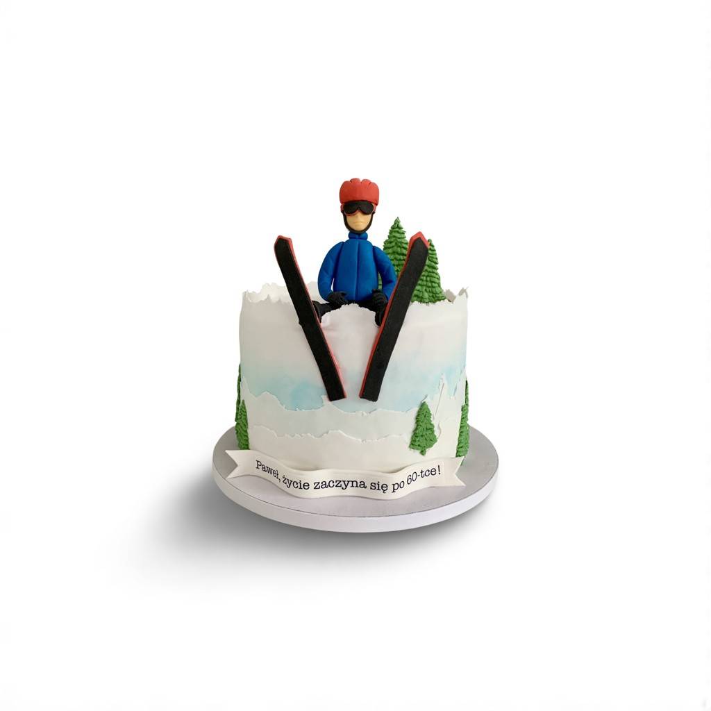 Tort narciarza to niebanalna propozycja dla fanów zimowych sportów, szczególnie narciarstwa. Idealnie sprawdzi się na urodziny, jubileusz, imprezę emerytalną lub każdą inną okazję, podczas której chcemy podkreślić pasję solenizanta. Na zdjęciu widoczny jest tort przedstawiający narciarza w dynamicznej pozie, ubranego w niebieską kurtkę, czerwony kask i czarne gogle. Figurka znajduje się na tle białych szczytów, które przypominają alpejskie krajobrazy, uzupełnione zielonymi świerkami. Całość wieńczy zabawny napis „Pawle, życie zaczyna się po 60-tce!” – istnieje możliwość dowolnej personalizacji.