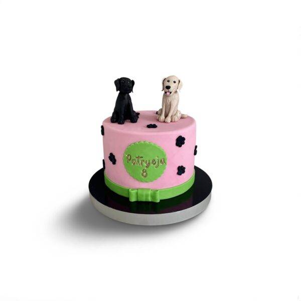 Tort “Pieski” to wyjątkowa propozycja dla dzieci i dorosłych, którzy kochają zwierzęta, a w szczególności psy. Na zdjęciu przedstawiono jednopiętrowy tort o uroczej, pastelowo-różowej polewie, ozdobiony dekoracjami w kształcie łapek oraz dwiema figurkami psów: czarnym i beżowym. Całość dopełnia zielony pas z cukrową kokardą oraz personalizowany medalion z imieniem solenizantki i wiekiem.