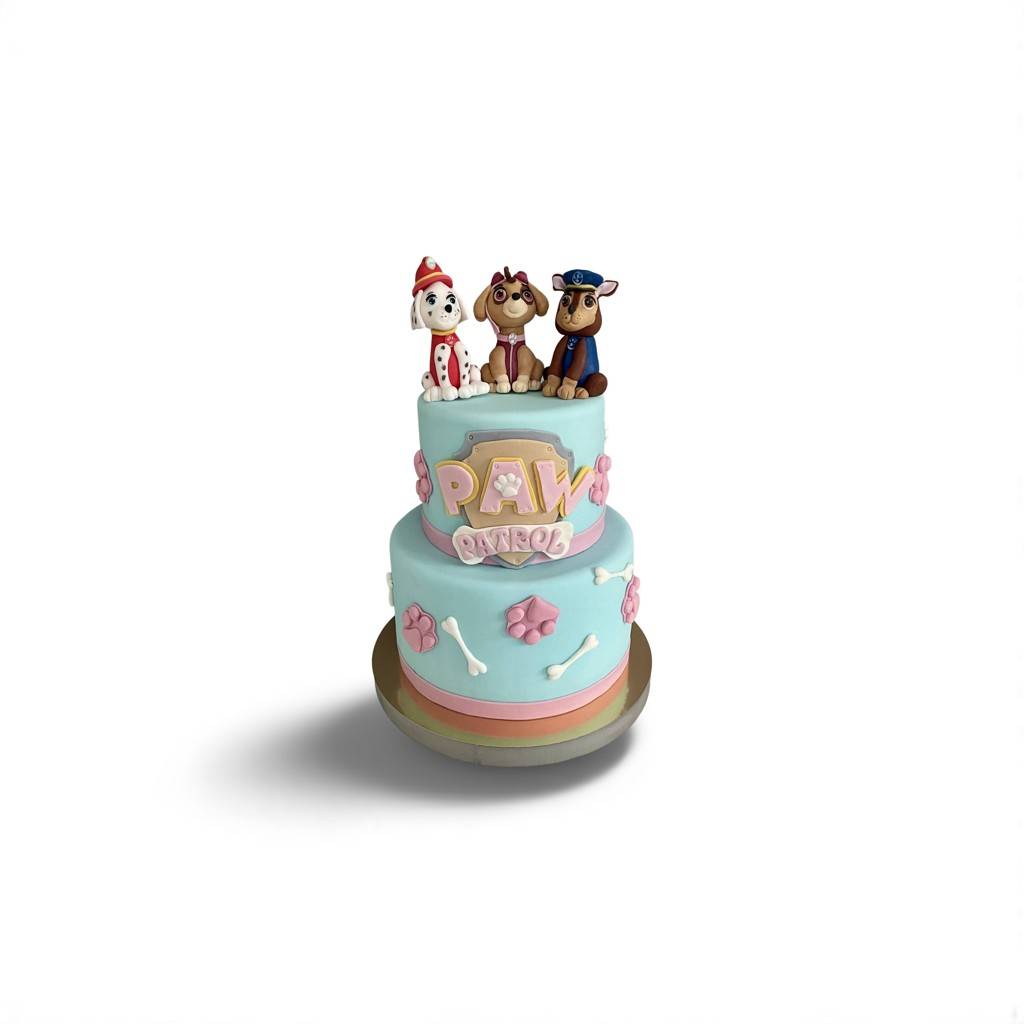 Tort dwupiętrowy utrzymany jest w pastelowej tonacji błękitu z różowymi i białymi akcentami – idealny wybór dla dziewczynki. Dolna warstwa ozdobiona jest kolorowymi elementami w kształcie kostek i łapek, typowymi dla psiej estetyki, oraz dekoracyjną wstęgą w odcieniach różu i złota. Górne piętro przyciąga uwagę napisem „PAW Patrol” wykonanym z masy cukrowej i zajmującym centralne miejsce na froncie.