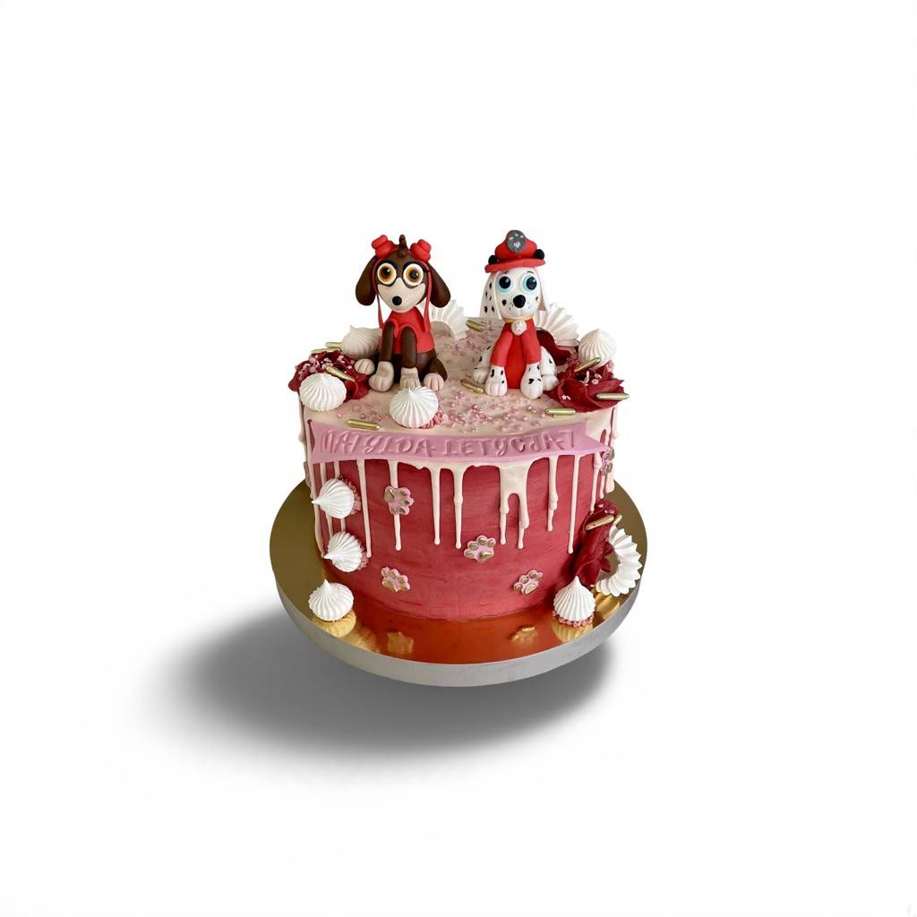 Tort Psi Patrol Skye i Chase to wymarzony wybór dla każdego dziecka, które kocha przygody dzielnych piesków z popularnej bajki “Psi Patrol”. Na zdjęciu przedstawiono uroczy, różowo-czerwony tort ozdobiony figurkami dwóch bohaterów – Skye i Chase’a – wykonanymi z jadalnej masy cukrowej. Całość dekorowana jest białą czekoladową polewą drip, bezikami, różami z kremu i cukrowymi łapkami. Tort doskonale sprawdzi się jako atrakcja na urodziny dla dziewczynki, która uwielbia Skye, oraz chłopca – fana dzielnego Chase’a.