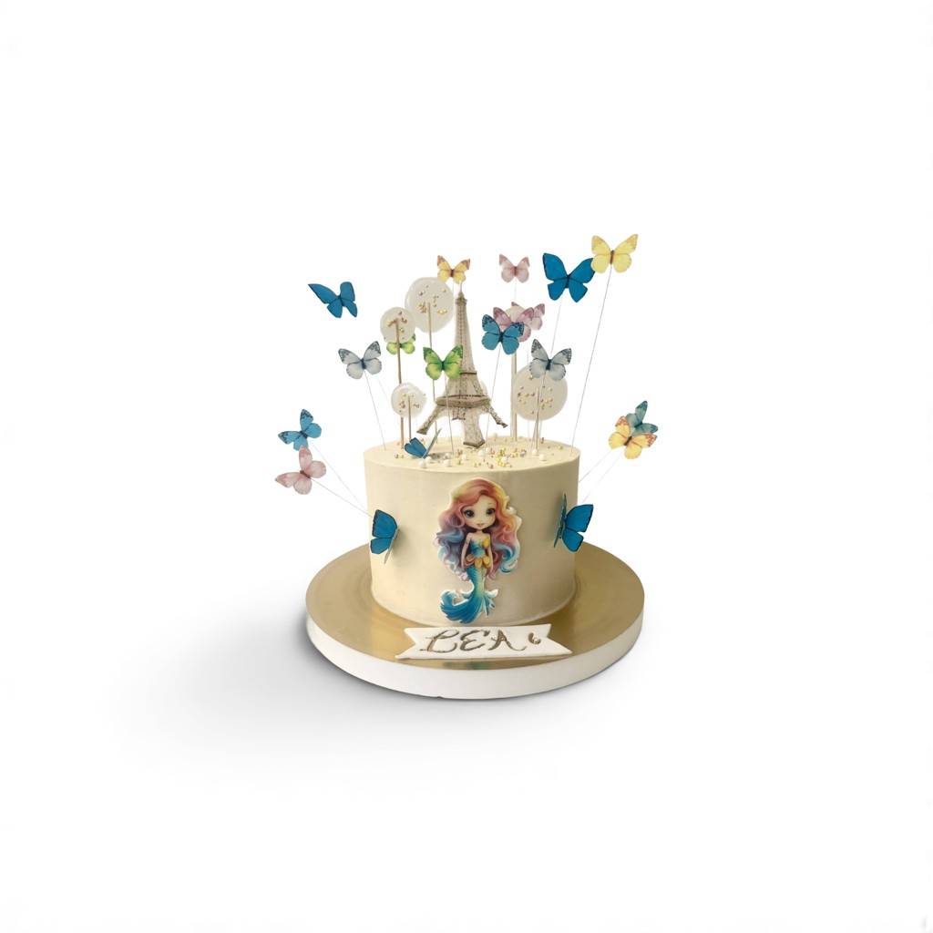 Tort Syrenka i Motylki to bajkowy tort urodzinowy dla małej księżniczki, która kocha kolorowy świat fantazji. Ten wyjątkowy tort zachwyca nie tylko smakiem, ale i niezwykłym wyglądem. Na froncie tortu znajduje się wizerunek syrenki o długich kolorowych włosach, a jego powierzchnię zdobią unoszące się nad tortem lekkie, kolorowe motyle i elegancka figura Wieży Eiffla – symbol marzeń i magii.
