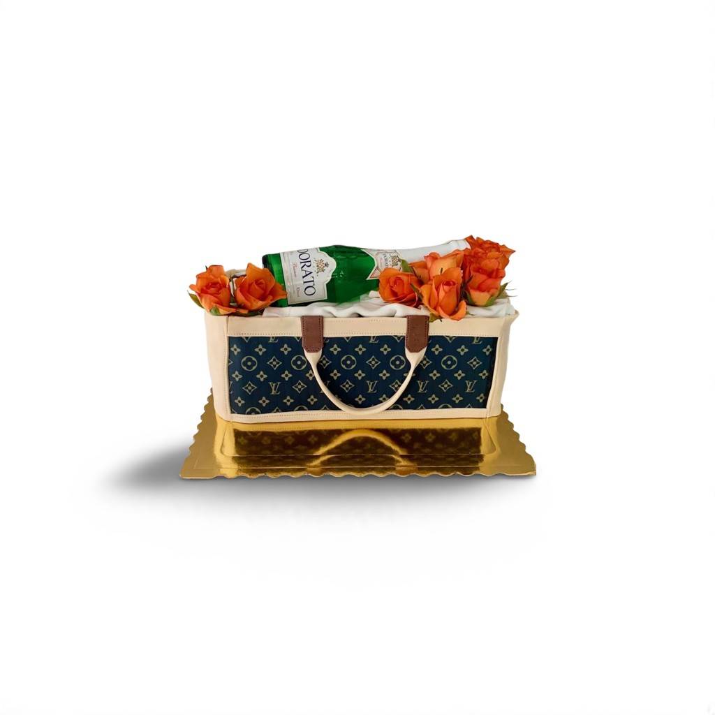 Tort został zaprojektowany w formie luksusowej torby podróżnej Louis Vuitton. Wzór na powierzchni przypomina charakterystyczny monogram marki na ciemnogranatowym tle, odwzorowany z wyjątkową precyzją. Boki i rączki wykonane są z masy cukrowej w kolorze beżowym i brązowym, imitując skórzane elementy. Górną część tortu zdobi realistyczna replika butelki szampana oraz bukiet pomarańczowych róż, które dodają kompozycji koloru i szyku.
