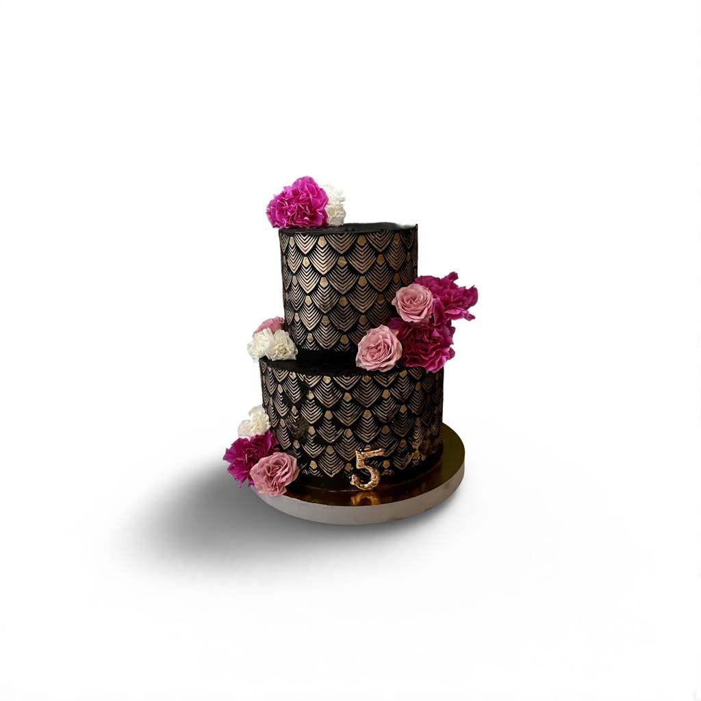 Tort pokryty jest ciemną masą cukrową ozdobioną złotym, wzorzystym motywem przypominającym łuski lub wachlarze. Dolna i górna warstwa tortu utrzymane są w tej samej stylistyce, tworząc elegancką, spójną formę. Kompozycję uzupełniają jadalne kwiaty w kolorze fuksji, pudrowego różu i bieli, umieszczone asymetrycznie na bokach tortu. Na podstawie tortu umieszczona jest złota liczba „5” – symbol wieku solenizanta, który może być dowolnie zmieniony.