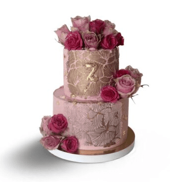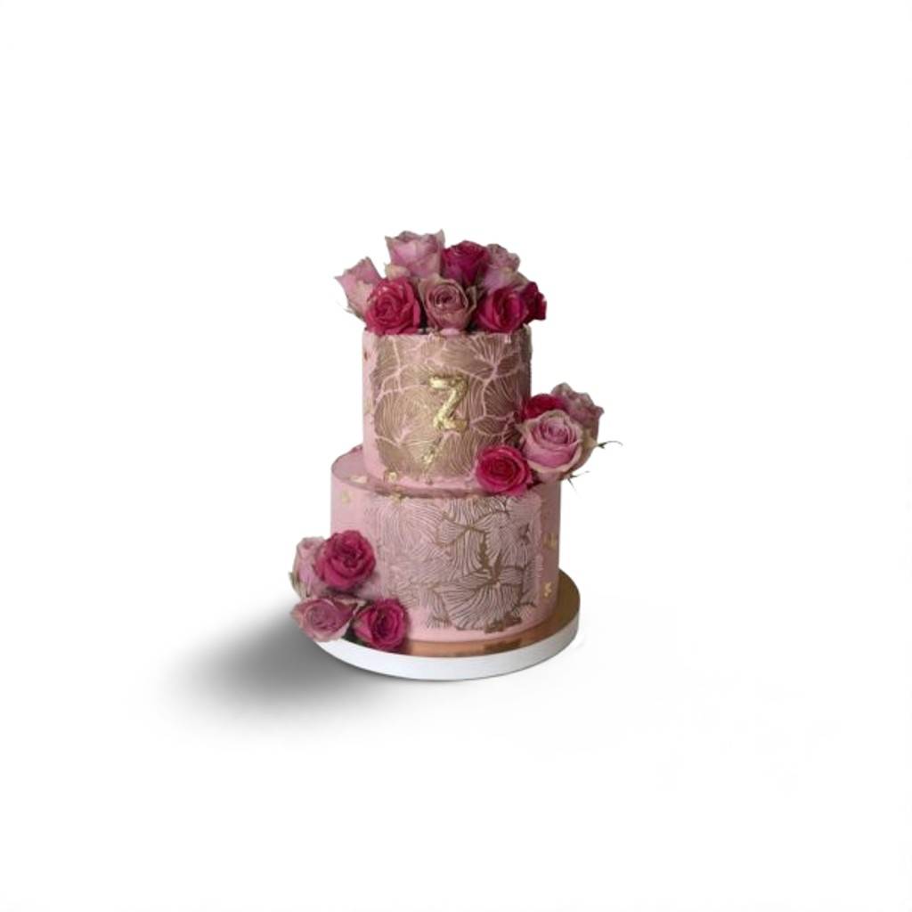 Dwupiętrowy tort pokryty jest pastelowym różowym kremem, ozdobiony delikatnymi, tłoczonymi wzorami w złotym kolorze. Górna warstwa przyozdobiona jest literą „Z” wykonaną z masy cukrowej lub czekoladowej, co sugeruje możliwość personalizacji inicjałem solenizantki. Bukiety żywych róż w odcieniach bordo, różu i fuksji ułożone są na górze, z boku oraz przy podstawie tortu, dodając całości elegancji i wyrazistego charakteru.