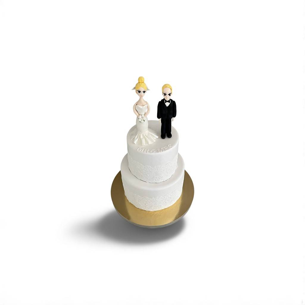 Tort wykonany został w stylu klasycznym. Białe warstwy pokryte są idealnie gładkim kremem maślanym, ozdobionym tłoczeniami przypominającymi delikatną koronkę. Na wierzchu tortu znajdują się dwie figurki – elegancka Panna Młoda w sukni z trenem i Pan Młody w czarnym garniturze. Figurki mogą być wykonane z masy cukrowej, masy plastycznej lub jadalnego modeliny.