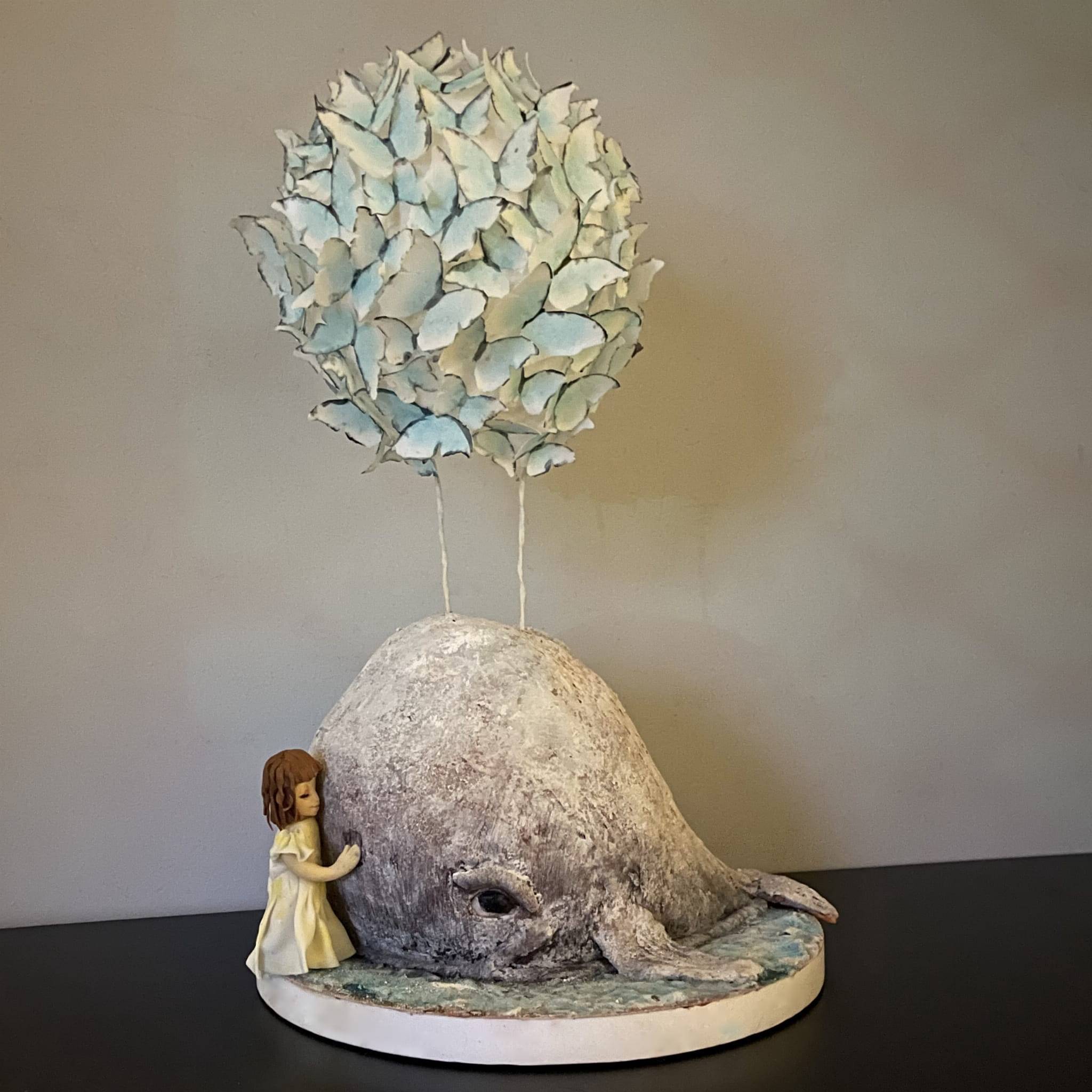 W centrum kompozycji znajduje się realistycznie odwzorowany wieloryb, z lekko pochyloną głową i dużym, wyrazistym okiem. U jego boku znajduje się dziewczynka w sukience z masy cukrowej, a nad nimi unoszą się „bańki” z płatków przypominających motyle lub liście – subtelne, jadalne dekoracje, które nadają tortowi bajkowy charakter.