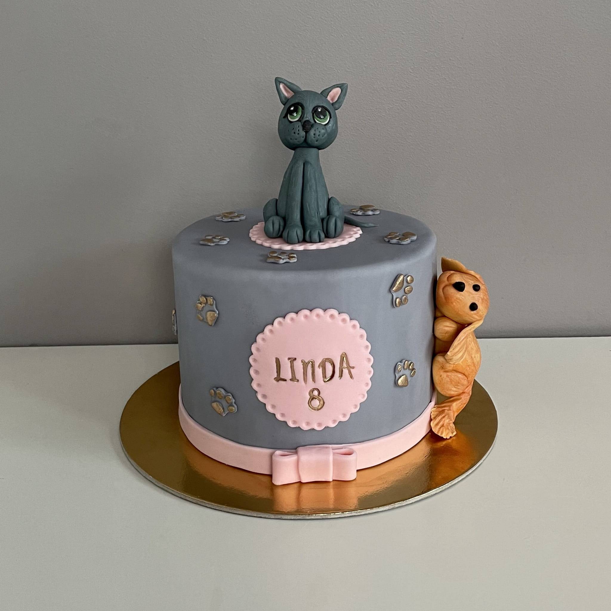 Tort z kotkiem i pieskiem to idealna propozycja dla dzieci uwielbiających zwierzęta domowe. Prezentowany model tortu został wykonany w pastelowej kolorystyce – szaro-różowej, z delikatnymi dekoracjami w kształcie łapek i ozdobnymi figurkami kota oraz psa. Centralnym elementem górnej części tortu jest realistycznie wykonana figurka kotka z wielkimi, zielonymi oczami, natomiast z boku wyłania się słodki piesek o brązowym futerku.